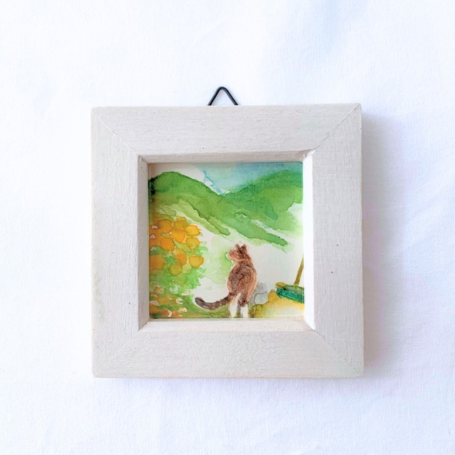 【Cat's Horizon/猫のゆくえ #5】 オオイヌフグリのちいさなあおが ミモザにきいろい春を連れてきた 移ろう景色の中に、 ぽつんと置かれたちいさな猫。 自然と人間とを繋ぐ きまぐれな仲介人と一緒に お山の景色を探索します。 「猫のゆくえ」シリーズは、 季節と共に変化する風景と、 その中を猫と自由に歩み味わう、 小さな水彩ドローイングのシリーズです。 その時一瞬の景色に触れ、感じた手触りを 画面に描き留めていきます。 ミニ額のコンパクトなサイズ感は、 玄関や書斎など、 心を落ち着かせたい場所の空間に さりげなく静かに馴染みます。 季節や自然を愛でる方、 猫との穏やかな暮らしを大切にする方へ 一点ものの原画です。 * * * * * ドローイング原画(額装付) 作品サイズ / 78mm×54mm (額装/99mm×77mm×9mm) 使用画材 / 水彩紙、水彩絵具、色鉛筆 (額装 / 木、塩ビシート、ネジ、金具) 制作年 / 2026年 送料/ 全国一律 290円(ネコポス) ※ 原画は全て一点ものになります。 ※ 著作権は譲渡いたしません。 ※ 作品データは、自身のHPやSNSで随時掲載します。 ※ 画像と多少の色味の違いがある場合がございます。 ※返品は受け付けておりません。 作品に関して質問等ございましたら、 お気軽に、事前にご連絡下さい。