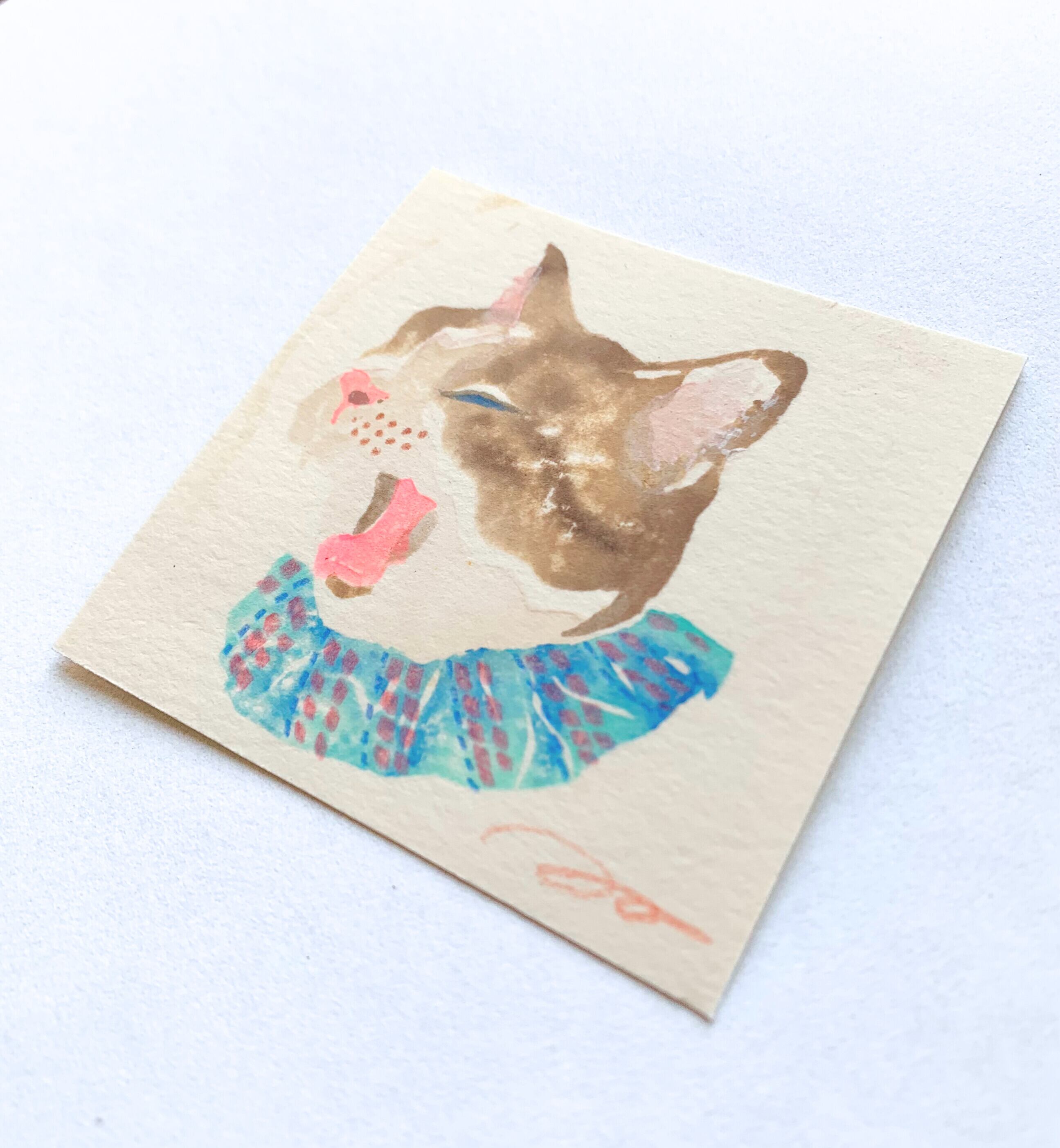 シュシュをつけた猫の木版画。